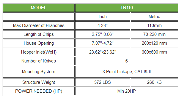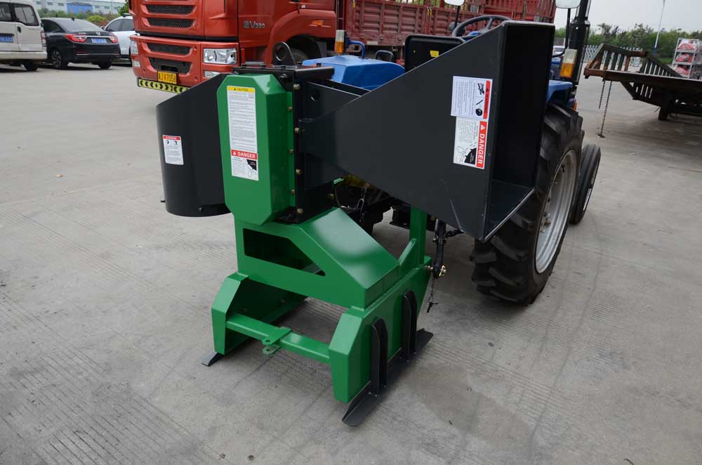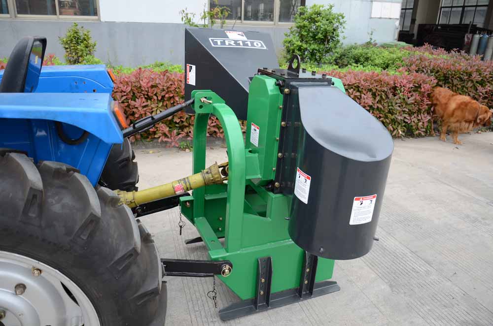 The TR110 Branch logger is mounted on the rear three-point hitch on the tractor.