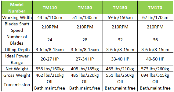 Farmer-Helper’s “FH-TM” Tillers are the ideal machines for preparing any kind of soil for planting, landscaping your property, or mixing supplements into your soil. These rugged machines are designed and sized to work with tractors from 20-50 HP. They are designed for use with any make or model of tractor with a standard cat-I 3-point hitch. Because this is a forward turning tiller, it requires less horsepower and maintains tilling depth you set. Maximum tilling depth is 6 inches. The working width offered are 43”, 51”, 59” and 67” with adjustable working depths up to 6 inches deep.