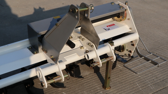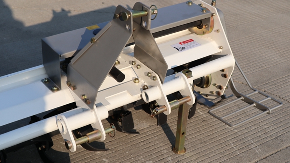 Rotary tiller with through-shaft • Manual 3 point hitch, does not require any use of levers. • Chain drive in oil bath. • Cast iron gearbox with hexagonal through-passing shaft, with reducer