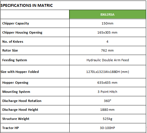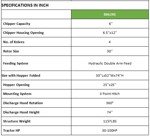 At the heart of the Farmer Helper based BX62RSA Chipper is an oversized heavy duty rotor and reversible chipping blades. The large diameter rotor has a faster tip speed for improved chipping action and the heavy gauge steel keeps your momentum to power through 7” diameter branch or 6.5 x 12” slabs.